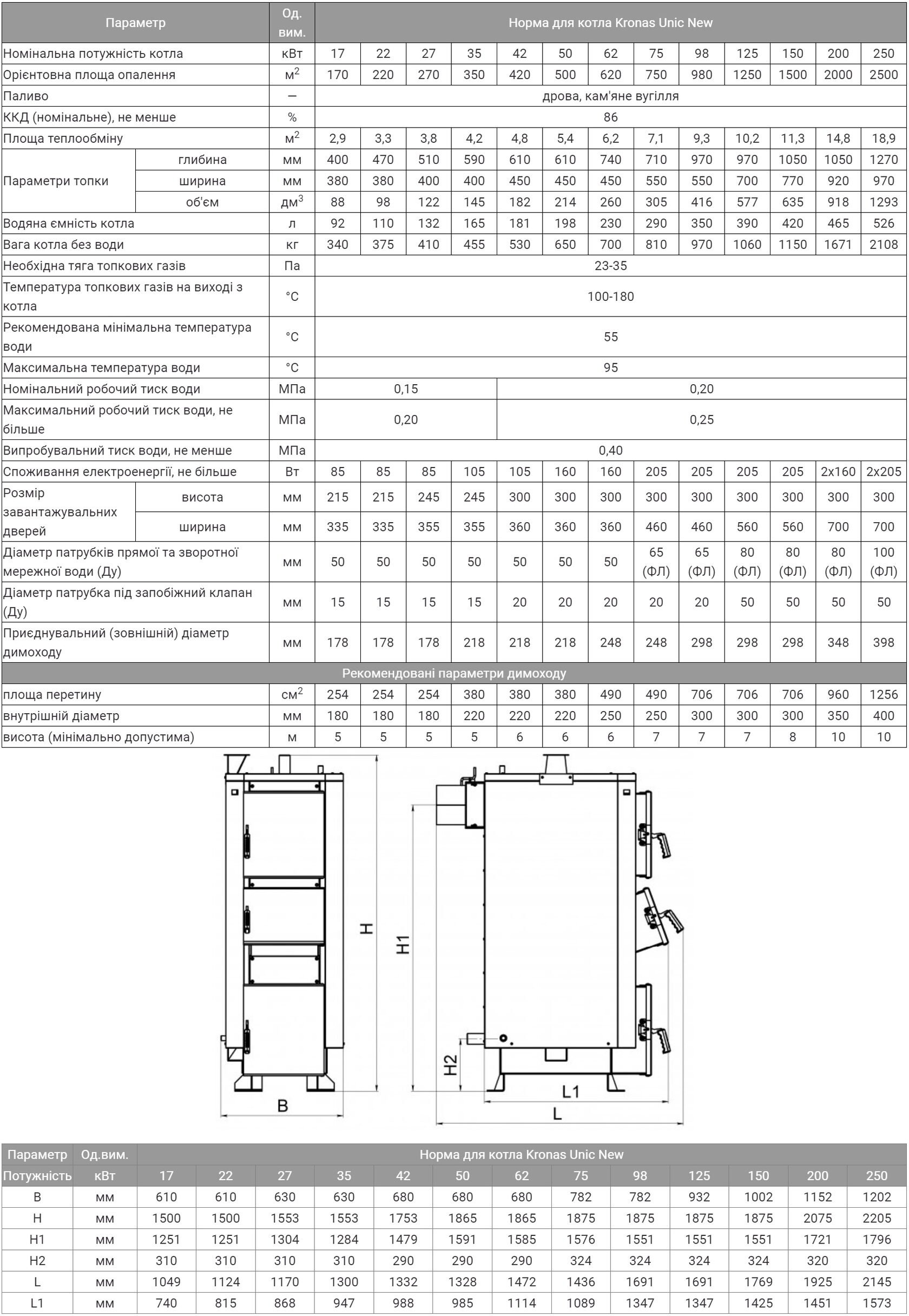 Твердопаливний котел KRONAS UNIC NEW - це котел тривалого горіння. Завдяки великій топці і багатоходовому теплообміннику на чотири полки, а також наявності форсунок для подачі вторинного повітря, котли серії UNIC NEW мають максимальні показники в класі.